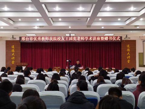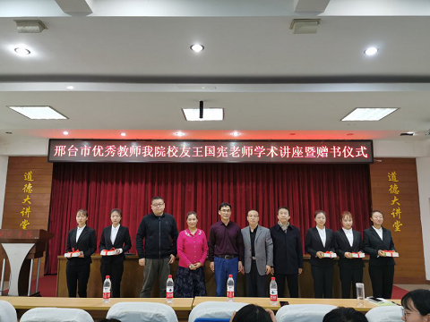 为加强我院师范教育专业与基础教育的深入对接,提升师范专业毕业生教学技能和实践能力, 11月3日上午9:00,由我院专业教研室具体组织,在图书馆学术报告厅举办了"邢台市优秀教师、我院校友王国宪老师学术讲座暨赠书仪式"。